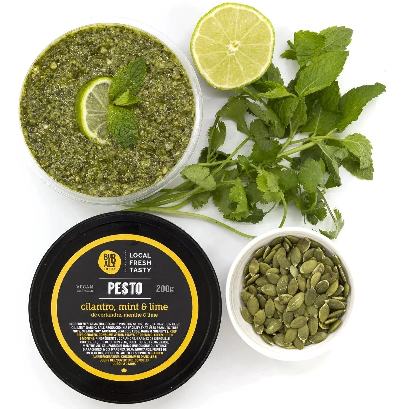 Ingredients: cilantro, organic pumpkin seeds, lime, extra-virgin olive oil, mint, garlic, & salt.